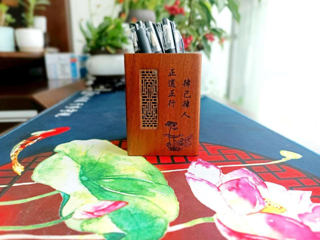 廉洁笔筒外观四四方方,配以象征廉洁的莲花图案,又刻印了廉洁文化理念,寓意为人正直、遵规守纪、清正廉洁,把严肃的廉洁教育与活泼的艺术性相结合,日常适用、时时提醒,寓教于理、寓教于乐。