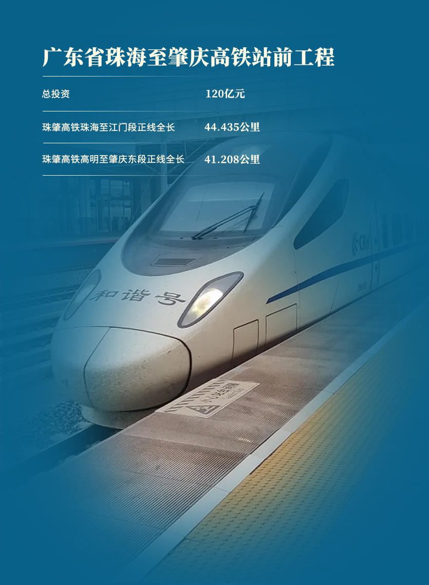 2023年5月26日,广州公共资源交易公共服务平台发布了《新建珠海至肇庆高铁珠海至江门段站前工程施工总价承包招标中标候选人公示》、《新建珠海至肇庆高铁高明至肇庆东段站前工程施工总价承包招标中标候选人公示》,项目总投资约120.06亿元。