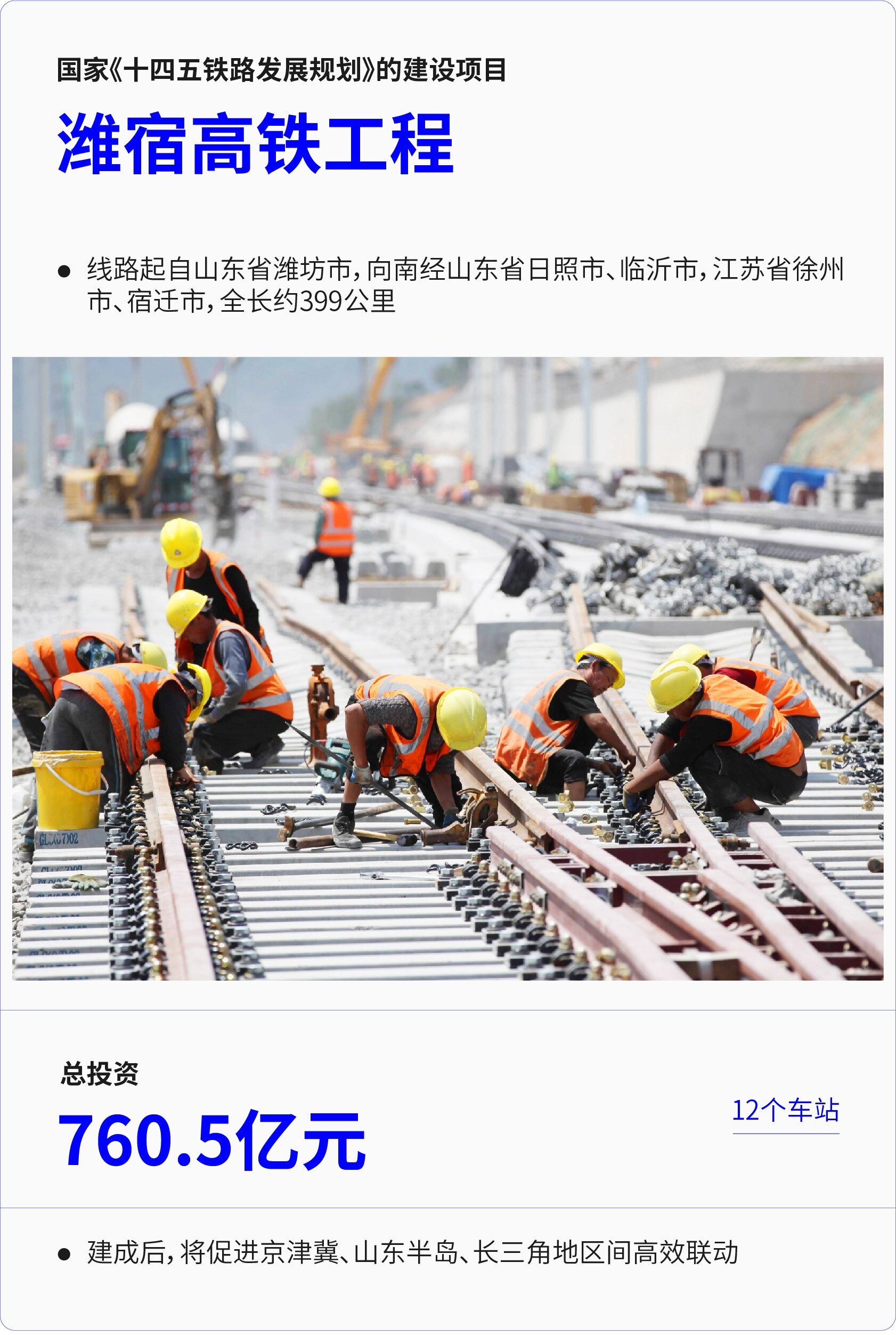 潍宿高铁是中长期铁路网规划中京沪辅助通道的组成部分,是国家《十四五铁路发展规划》的建设项目。线路起自山东省潍坊市,向南经山东省日照市、临沂市,江苏省徐州市、宿迁市,全长约399公里,估算总投资760.5亿元。全线设潍坊北站、安丘站、诸城西站、五莲北站、莒县北站、沂南站、临沂北站、兰陵站、郯城西站、新沂东站、宿迁东站、洋河北站(越行站)共12个车站。