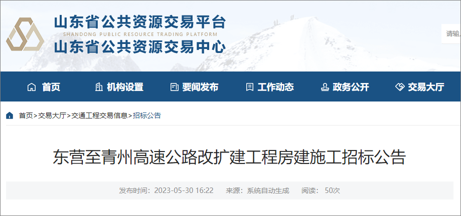 2023年5月30日,山东公共资源交易平台发布了东营至青州高速公路改扩建工程房建施工招标公告,该项目概算投资约128亿元,建设工期36个月。