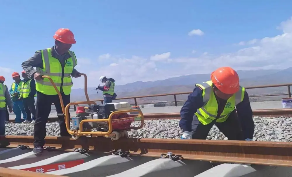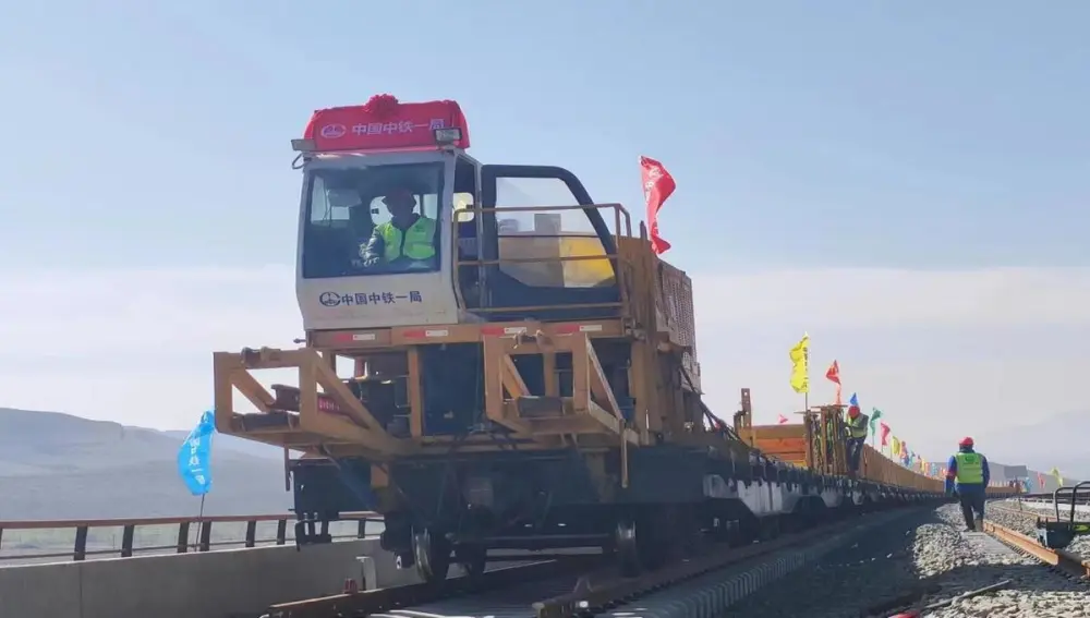 传统铺轨机的牵引车分碰到有砟无砟工况转换就特别费时费力。改进后的新型长钢轨牵引车,每次工况转换就能节约4个小时,全线下来节约104个小时,相当于可铺设18公里的轨道,施工单位负责人荔文辉介绍道。同时,为了保障前方施工路料的安全供应,施工单位还投入使用了轨道工程运输管理智控平台、自动锁定小平车和龙门架滑触线取电系统等新技术,有效提高了铺轨施工组织和线路物资运输的信息化水平。