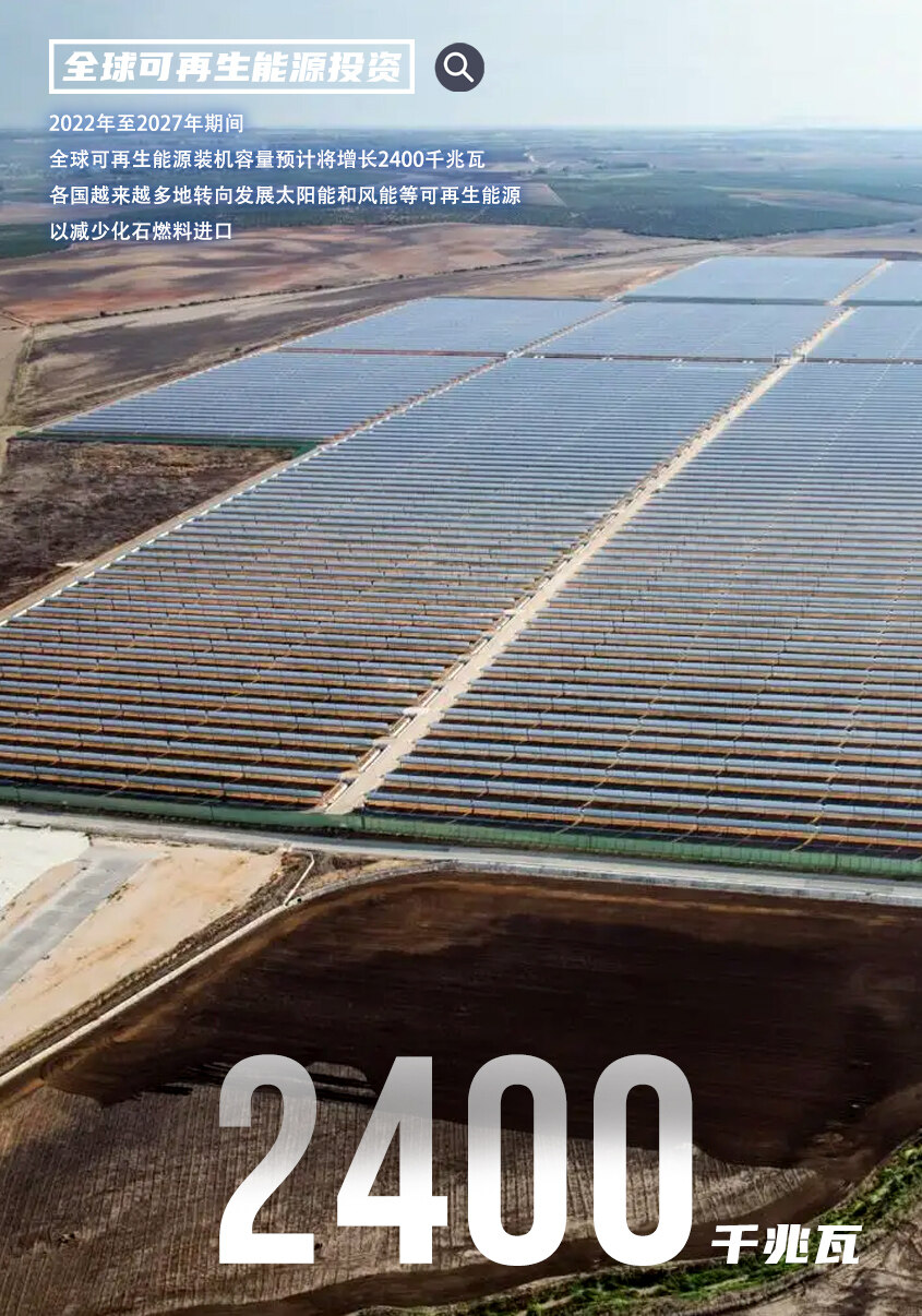 俄乌冲突加剧了人们对能源安全的担忧,各国越来越多地转向发展太阳能和风能等可再生能源,以减少化石燃料进口。根据《2022年可再生能源》报告,2022年至2027年期间,全球可再生能源装机容量预计将增长2400千兆瓦(GW),相当于目前中国的总发电量。