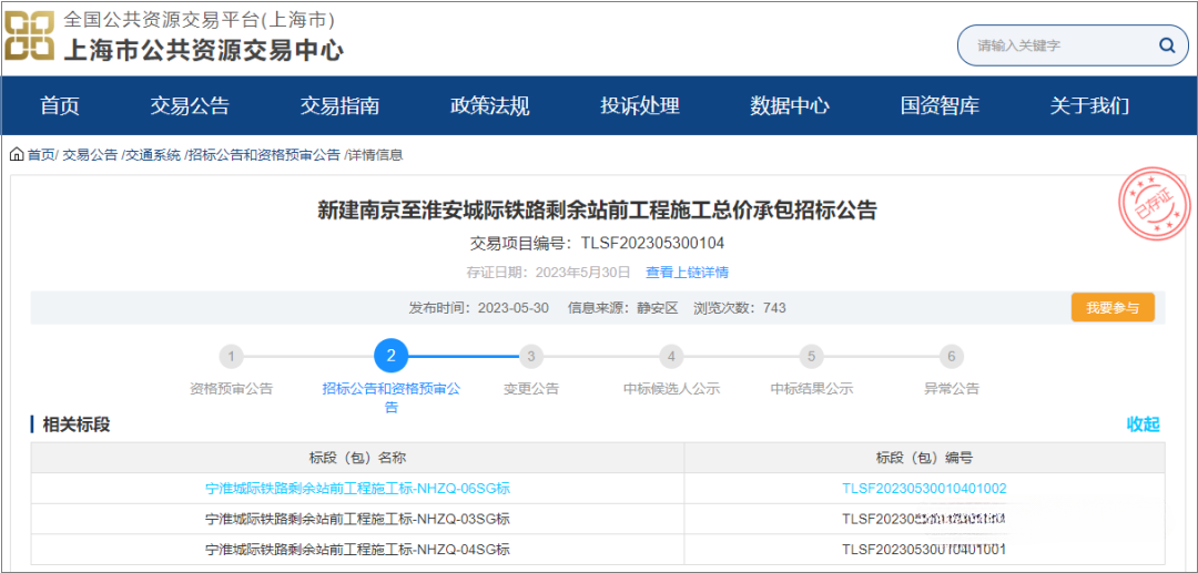 On May 30, 2023, the bidding announcement for the construction of the remaining pre station works of the Nanjing Huai'an intercity railway in sections 03, 04, and 06 was released. Previously, the Huai'an section in Jiangsu and the parallel sections 01, 02, and 05 of the Liuhe West and Shanghai Chongqing Chengdu high-speed railway were officially started in January 2023.