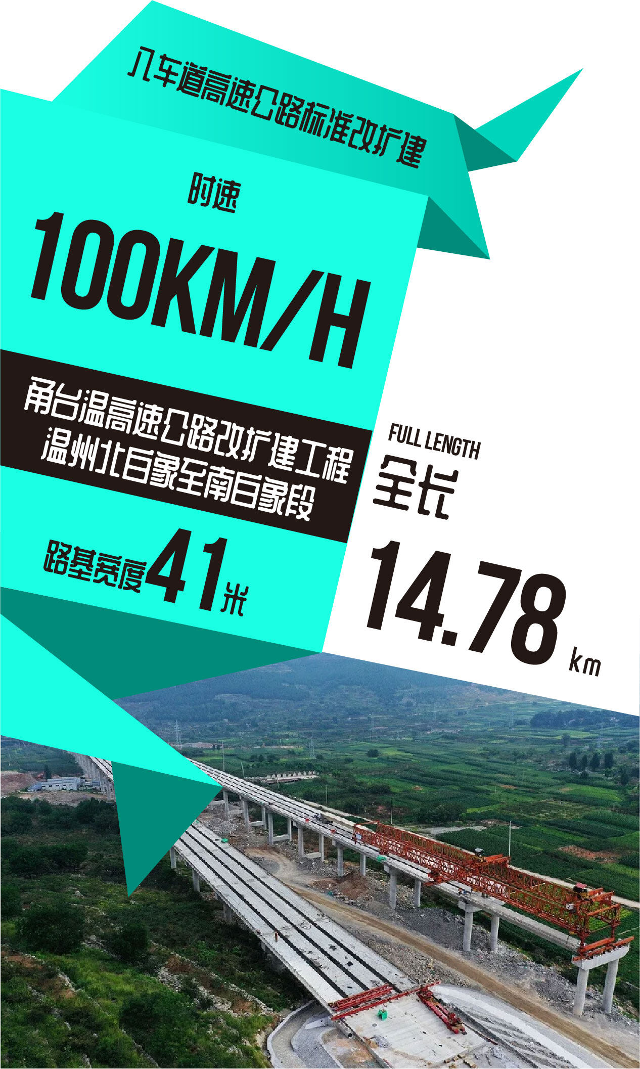 改扩建项目全线总体采用八车道高速公路标准改扩建,设计速度100公里/小时,整体式路基宽度41米。其中,温州大桥北互通段1.029公里两侧分离各新建3车道,与既有高速形成“3+2+2+3”的十车道断面,新建单幅路基宽度16.75米。新建和拼宽桥梁设计汽车荷载等级采用公路I级,利用既有桥梁沿用原荷载标准,其他技术指标按《公路工程技术标准》(JTGBOl-2014)执行。