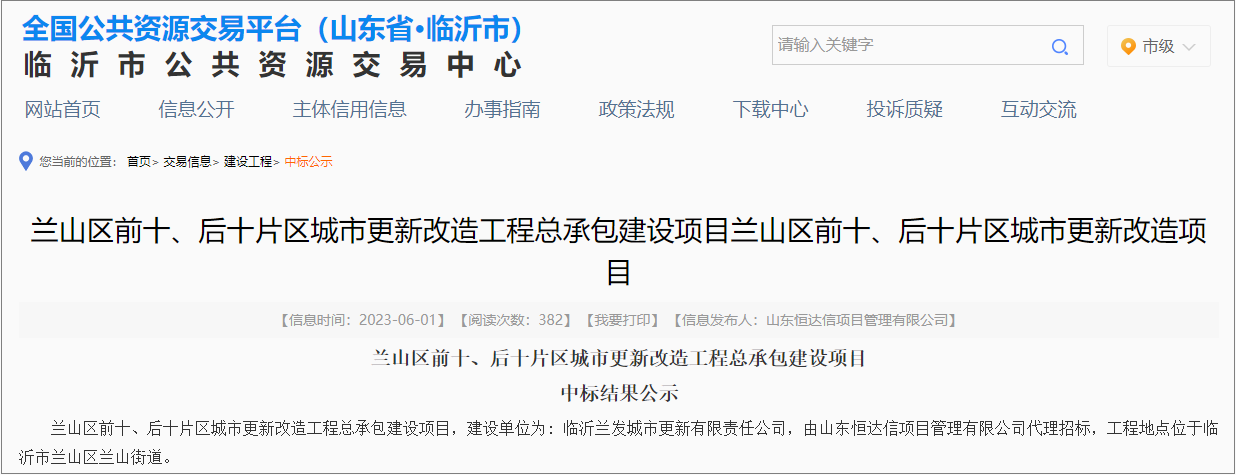 في 1 حزيران / يونيه 2023 ، ليني الموارد العامة مركز التجارة أصدرت الإعلان العام عن المرشحين الذين فازوا في العام عقد مشروع التجديد الحضري في أول 10 و 10 مناطق في مدينة ليني انشان . المشروع فاز بها اتحاد يضم 5 وحدات ، بما في ذلك الصين بناء البحر المحدودة ، والصين بناء المشاريع الدولية المحدودة ، مع استثمار ما مجموعه حوالي 6 مليار يوان .