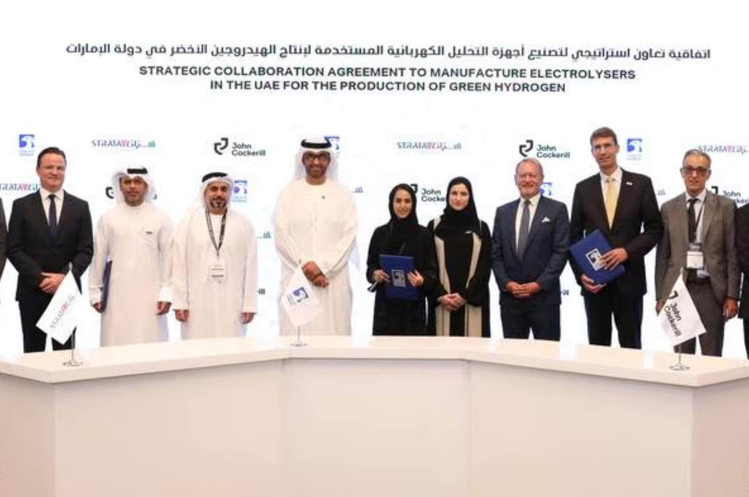 ووقعت شركة ADNOC اتفاقا مع شركة Strata وصانع الآلات الصناعية جون كوكرير لإنتاج خلايا كهربائية في الإمارات العربية المتحدة للاستخدام المحلي والتصدير. وأشارت وزارة الصناعة والتكنولوجيا المتقدمة إلى أنه من المتوقع أن تساعد هذه الصفقة الإمارات العربية المتحدة على تطوير اقتصاد الهيدروجين الأخضر من خلال تصنيع خلايا كهربية محلية. وينطوي الهيدروجين الأخضر على التحليل الكهرمائي، حيث تستخدم الخلايا الكهرباء لفصل جزيئات الماء عن الهيدروجين والأوكسجين. وهذه العملية قادرة على التقاط وتخزين الهيدروجين الذي يمكن استخدامه كمصدر للوقود. وقال السيد عمر السويدي، نائب وزير الصناعة والتكنولوجيا المتقدمة، إن التعجيل بتنمية الصناعة في المستقبل هو أحد الأهداف الرئيسية للاستراتيجية الوطنية للصناعة والتكنولوجيا المتقدمة.