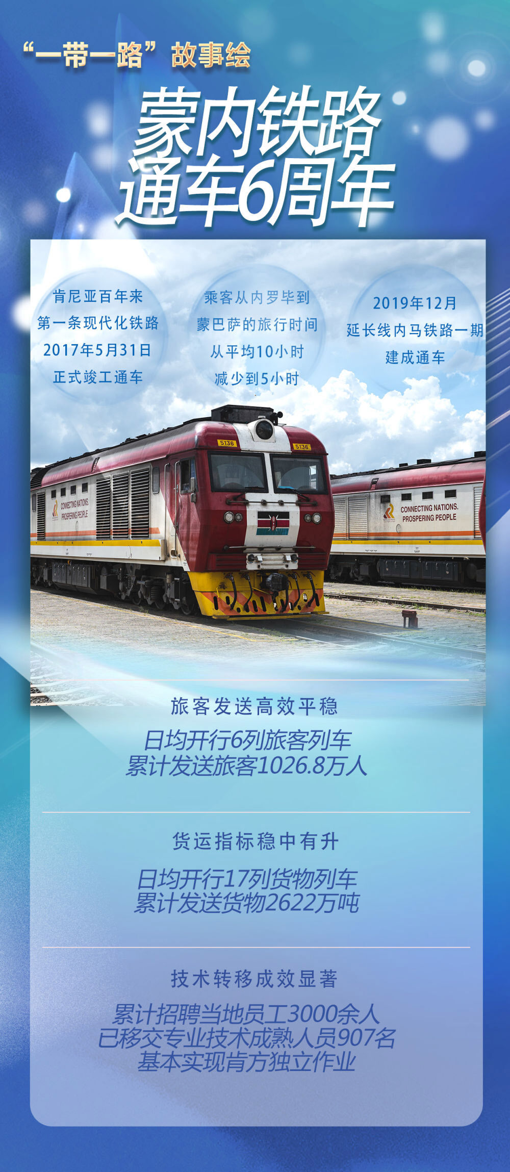 蒙内铁路累计创造当地就业4.6万个,员工本地化率超过80%,每天有近7000名旅客和约1.8万吨货物抵达目的地。