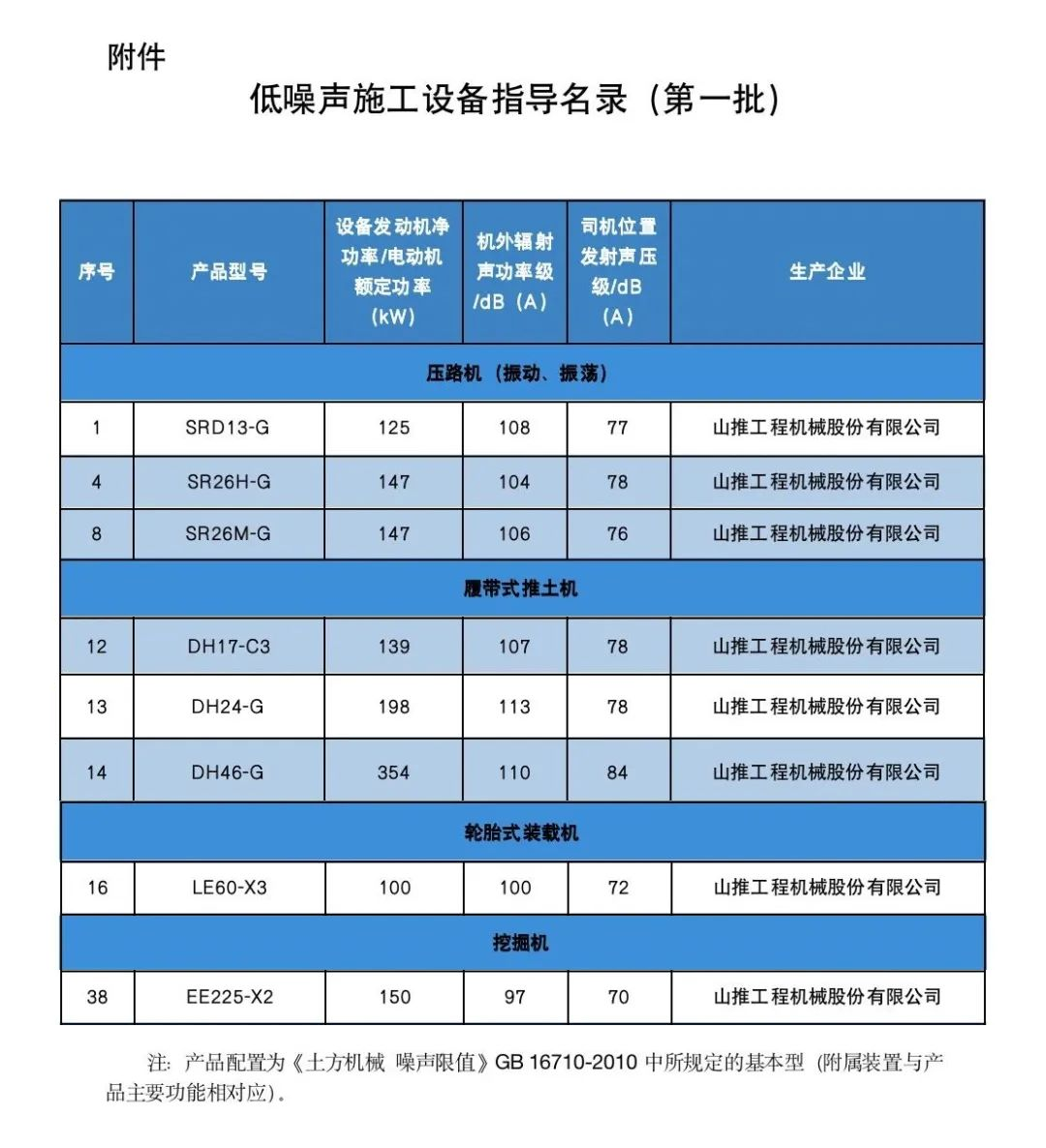 近日,中华人民共和国生态环境部网站公布了《低噪声施工设备指导名录(第一批)》名单,山推工程机械股份有限公司多款型号产品皆榜上有名。在公布的46个产品型号中,山推入榜压路机、履带式推土机、轮胎式装载机、挖掘机等众多拼类。SRD13-G双钢轮压路机、SR26H-G单钢轮压路机、SR26M-G单钢轮压路机、DH17-C3推土机、DH24-G推土机、DH46-G推土机、LE60-X3纯电装载机、EE225-X2挖掘机等多款明星产品上榜。