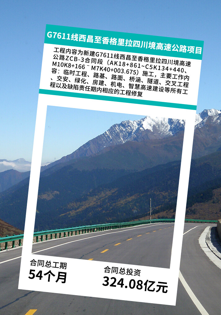 本协议工程内容为新建G7611线西昌至香格里拉四川境高速公路ZCB-3合同段(AK18+861~C5K134+440、M10K8+166ˉM7K40+003.675)施工,主要工作内容:临时工程、路基、路面、桥涵、隧道、交叉工程、交安、绿化、房建、机电、智慧高速建设等所有工程以及缺陷责任期内相应的工程修复。合同总金额约为324.08亿元。合同段总工期为54个月。