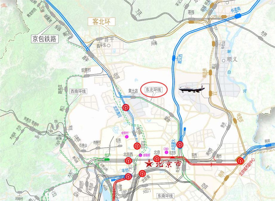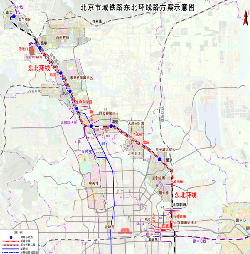 东北环线是区域快线网中西北方向与东北方向的联络线,能够与多条区域快线实现换乘,可助力实现全网网络化运输,对于完善北京枢纽内部联系具有重要的联络作用。