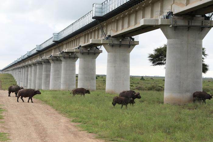 蒙内铁路穿越内罗毕国家公园、察沃国家公园等自然保护区。在其中游览时,游客可以观赏到大象、长颈鹿、水牛等动物在铁路大桥下悠闲地觅食和迁徙。