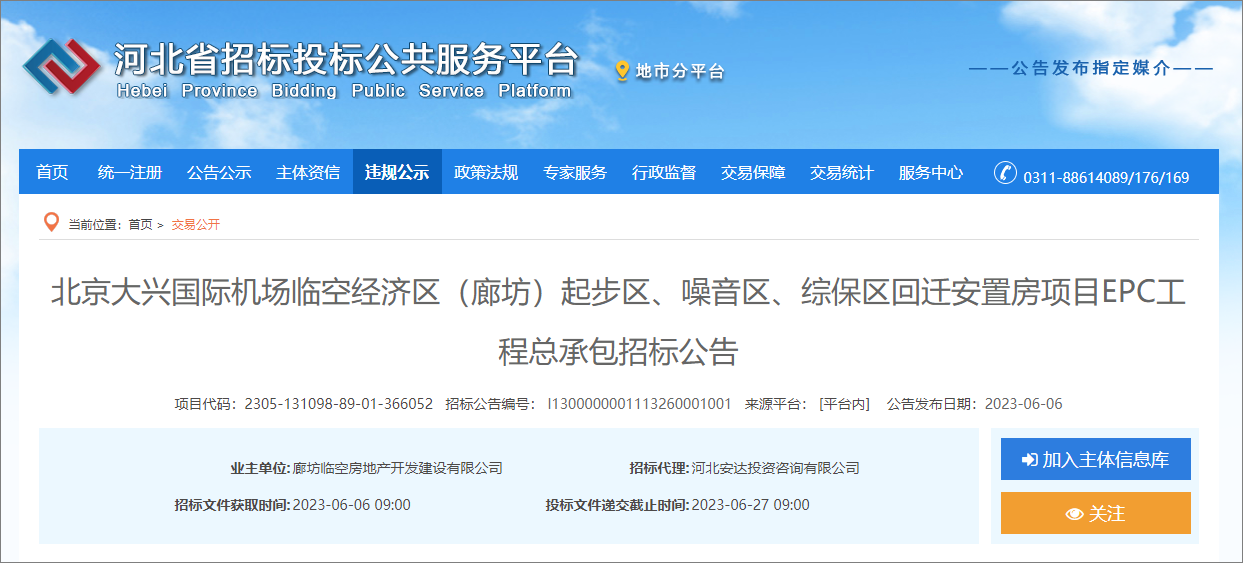 2023年6月6日,河北省招标投标公共服务平台发布了北京大兴国际机场临空经济区(廊坊)起步区、噪音区、综保区回迁安置房项目EPC工程总承包招标公告,该项目所属行业房建,招标人廊坊临空房地产开发建设有限公司,项目总投资40.06亿元。