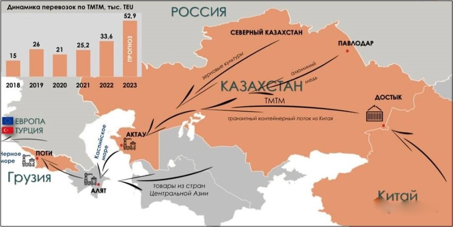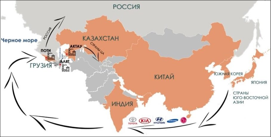 通过这个枢纽,一条全新的运输走廊将能够为企业家们服务。该线路从哈萨克斯坦出发,经里海、阿塞拜疆、格鲁吉亚、黑海,将货物发往世界任何地去。同时,回程货物从世界各地发至波蒂港的物流枢纽,再由那里通过铁路运往哈萨克斯坦和中亚国家。