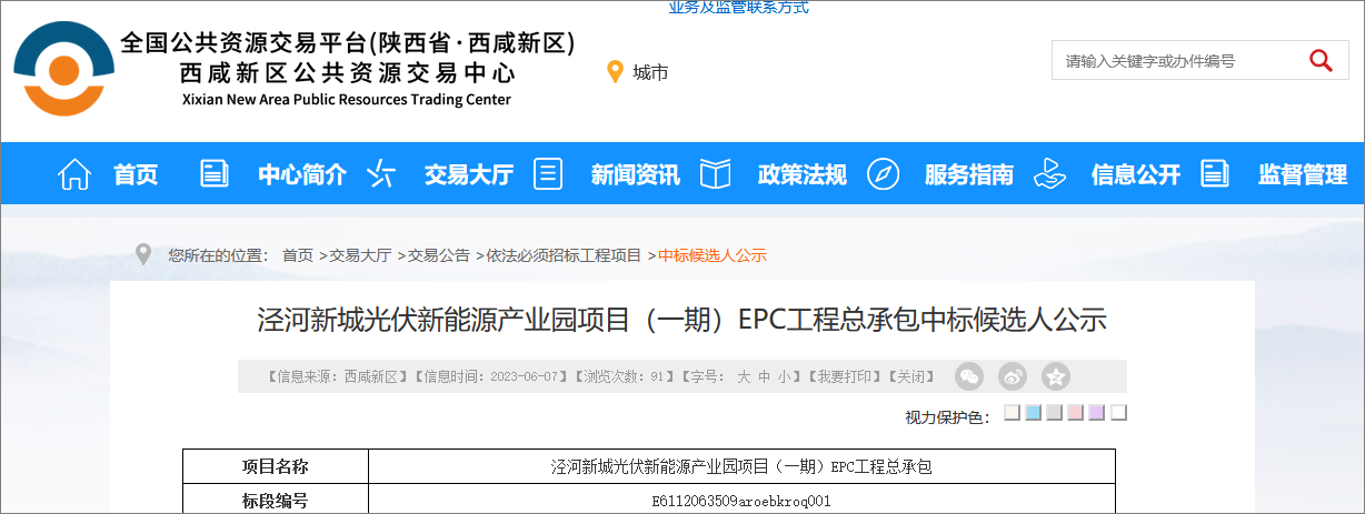 2023年6月7日,西咸新区公共资源交易中心发布了泾河新城光伏新能源产业园项目一期EPC工程总承包中标候选人公示,该项目由中国建筑第八工程局有限公司等4家单位中标,项目总投资约141.8亿元,本次招标估算额约128.11亿元。