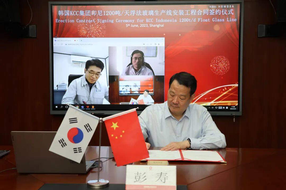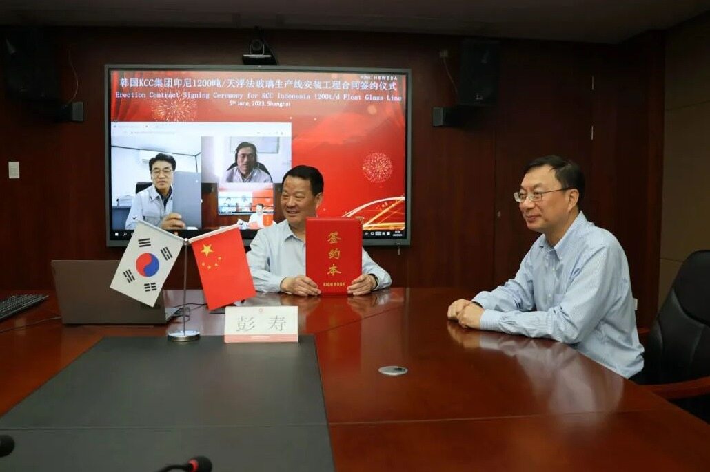 2023年6月5日,中国工程院院士、中国建材集团总工程师、凯盛科技集团董事长、中国建材工程集团董事长彭寿与韩国KCC Glass集团副社长朴元柱先生在线签署了印尼日熔化量1200吨浮法玻璃生产线安装工程合同。这是继EP总承包合同和环保工程合同之后,双方在该项目上的第3个合作成果,同时也是中国建材工程集团在海外玻璃项目的EP模式之外,涉足安装工程的又一次业务突破。