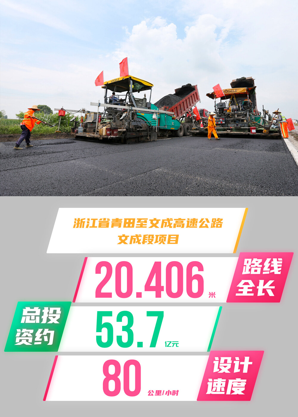 青田至文成高速公路文成段项目起点位于青田汤垟乡与文成县玉壶镇交界处的李山隧道内,向南途经文成县玉壶镇、周壤镇、大峃镇樟台乡,最后接入文成枢纽。全长约20.4公里,主线采用双向四车道高速公路标准,设计速度80公里/小时,建设工期为48个月。