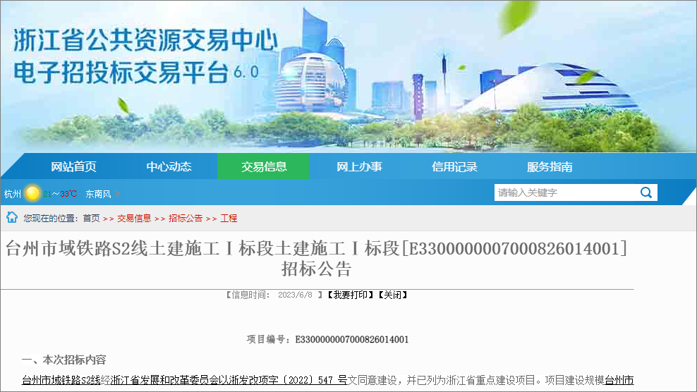 2023年6月8日,浙江省公共资源交易中心发布了台州市域铁路S2线土建施工招标公告,该项目所属行业铁路,招标人台州市交通投资集团有限公司,项目总投资约307.3亿元,计划于2027年建成。