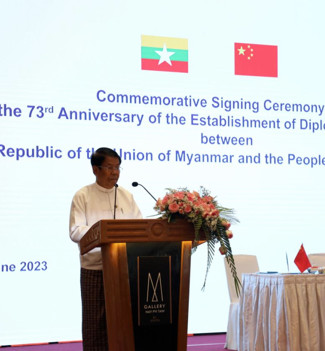 On the occasion of the 73rd anniversary of the establishment of diplomatic relations between China and Myanmar, Chinese Ambassador to Myanmar Chen Hai attended the signing and exchange ceremony of China Myanmar cooperation documents, such as the 2023 Myanmar project of the Lancang-Mekong Cooperation Special Fund, the new batch of 3 million doses of COVID-19 vaccine of China's assistance to Myanmar, the materials project of Myanmar's assistance for modern training laboratories, and the feasibility study of Myanmar's assistance for the reconstruction project of Aung San Stadium. Ministers or senior representatives of 10 federal ministries, including the Ministry of Foreign Affairs, the Ministry of Health, the Ministry of Science and Technology, the Ministry of Sports and Youth Affairs of Foreign relations of Myanmar, attended the meeting.