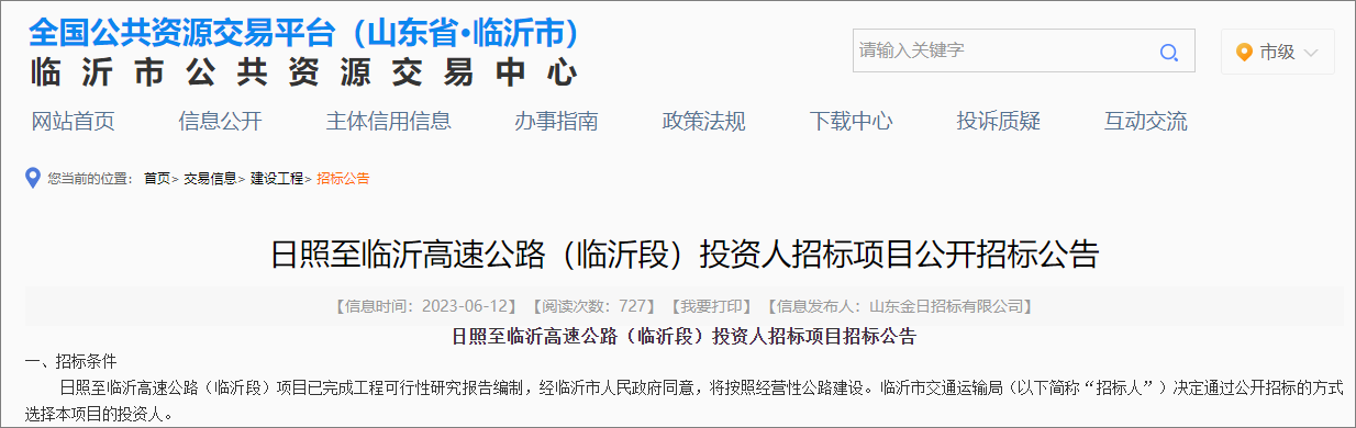 2023年6月12日,临沂市公共资源交易中心发布了日照至临沂高速公路临沂段投资人招标项目公开招标公告,该项目所属行业公路,招标人临沂市交通运输局,项目总投资约74.06亿元,计划工期3年。