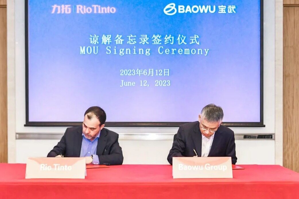 2023年6月12日,宝武与力拓在宝武大厦签署了气候变化合作项目谅解备忘录。双方将进一步深化合作,在中国和澳大利亚共同探索合作推进系列行业领先的脱碳项目,助力钢铁行业价值链实现绿色低碳转型。宝武党委常委、副总经理侯安贵与力拓首席商务官兼中国区主席白睿明 分别代表双方签署协议。