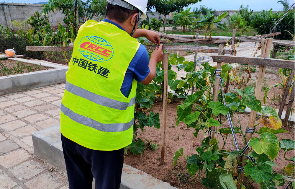 中铁十八局集团乌干达公司职工在营地“开心农场”给黄瓜搭建瓜棚