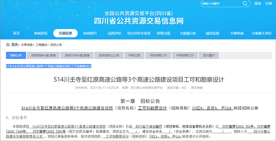 2023年6月13日,四川省公共资源交易信息网发布了S14川主寺至红原高速公路等3个高速公路建设项目工可和勘察设计招标公告,招标人为四川兴蜀公路建设发展有限责任公司,本次招标划分为3个标段,总里程约202公里。