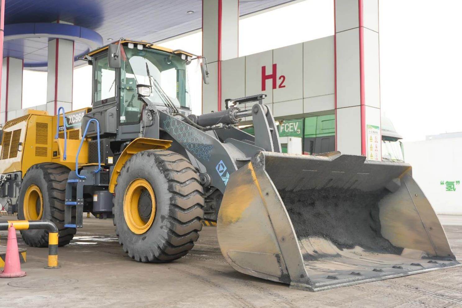 徐工氢能电动装载机,以氢气作为动力能源,在燃料电池系统与氧气发生化学反应产生电流,产物仅有电、热量与水,有效减少燃油造成的空气污染等问题,实现零碳排放。