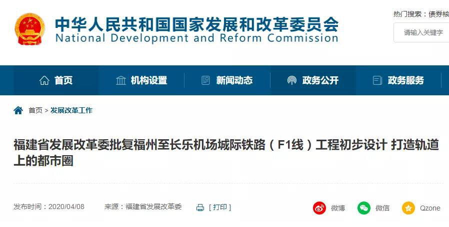 近日,福州至长乐机场城际铁路(F1线)工程初步设计获得福建省发改委正式批复。