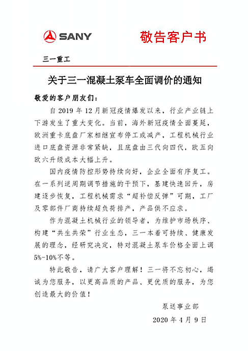 得益于国内下游企业复工复产及新基建政策的发力,对工程机械需求增大,许多工程机械制造企业超负荷生产。2020年4月9日,三一集团旗下三一重工泵送事业部发布了敬告客户书--《关于三一混凝土泵车全面调价的通知》,通知内容显示,其公司的混凝土泵车价格将上调5%~10%不等。