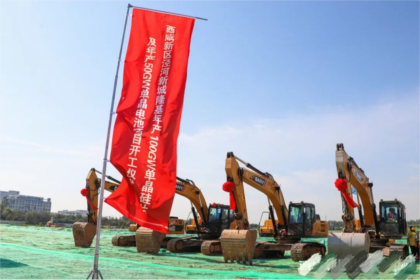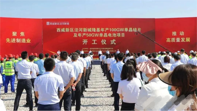 2023年6月15日上午,隆基年产100GW单晶硅片及年产50GW单晶电池项目厂区在西咸新区泾河新城开工建设。项目总投资约452亿元,是隆基公司全球建设规模最大、产能最高、技术最先进的光伏生产基地,建成后将带动就业1.5万人。