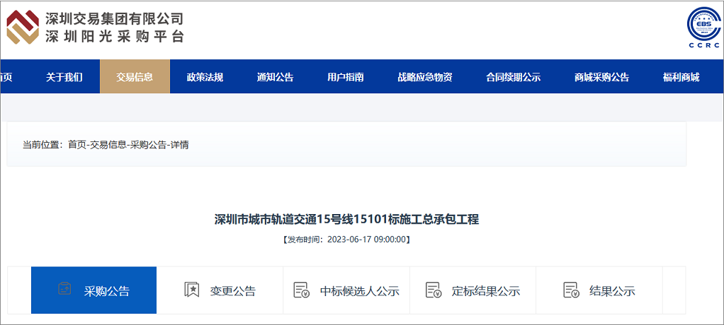 2023年06月17日,深圳阳光采购平台发布了深圳市城市轨道交通15号线施工招标公告,该项目所属行业轨道交通,招标人深圳市地铁集团有限公司,项目总投资335.9亿元。