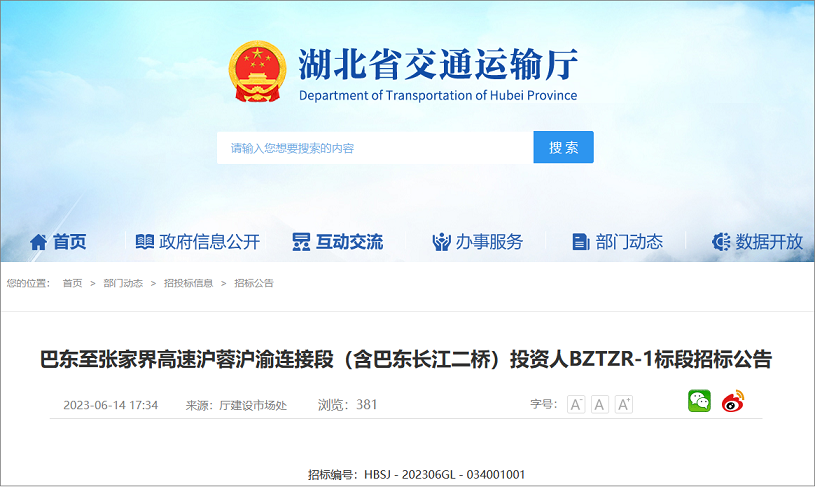 On June 19, 2023, Hubei Provincial Department of Transport released the bidding announcement for bid section BZTZR-1 of the investors of the Shanghai Chengdu Shanghai Chongqing connection section of Badong Zhangjiajie Expressway (including the second Badong Yangtze River Bridge). The project belongs to the industry highway, and the tenderee is the People's Government of Enshi Tujia and Miao Autonomous Prefecture. The total investment of the project is about 20.1 billion yuan, and the planned construction period is 2160 calendar days.