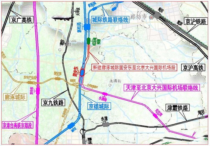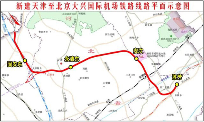 全线共设天津西站、胜芳站、大兴国际机场站等6座车站,新线设计时速250公里。