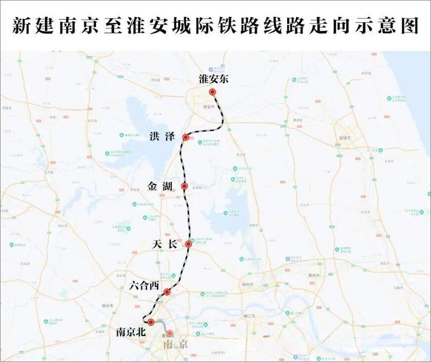 新建宁淮城际铁路北起自淮安市淮安东站,途径洪泽区、金湖县、安徽省天长市、南京市六合区至新南京北站,线路长度196.505km,利用连镇铁路淮安东至黄楼段17.14 km,新建线路长度179.365km,其中江苏段长度133.893km,安徽段长度45.472km,共设淮安东、洪泽、金湖、六合西、新南京北等5座车站。