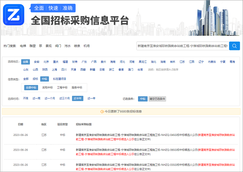 2023年6月26日,中国招标投标公共服务平台发布了新建南京至淮安城际铁路剩余站前工程-宁淮城际铁路剩余站前工程中标候选人公示,该项目共分为3个标段建设,投标价约80.6亿元。