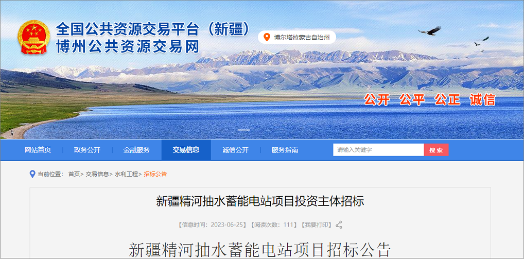 2023年6月25日,全国公共资源交易平台发布了新疆精河抽水蓄能电站项目招标公告,该项目已由博尔塔拉蒙古自治州发展和改革委员会批准,现进行公开招标。