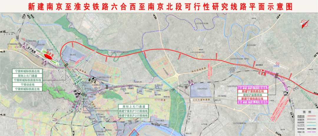 新建宁淮城际铁路北起自淮安市淮安东站,途径洪泽区、金湖县、安徽省天长市、南京市六合区至新南京北站,线路长度196.505km,利用连镇铁路淮安东至黄楼段17.14 km,新建线路长度179.365km,其中江苏段长度133.893km,安徽段长度45.472km,共设淮安东、洪泽、金湖、六合西、新南京北等5座车站。