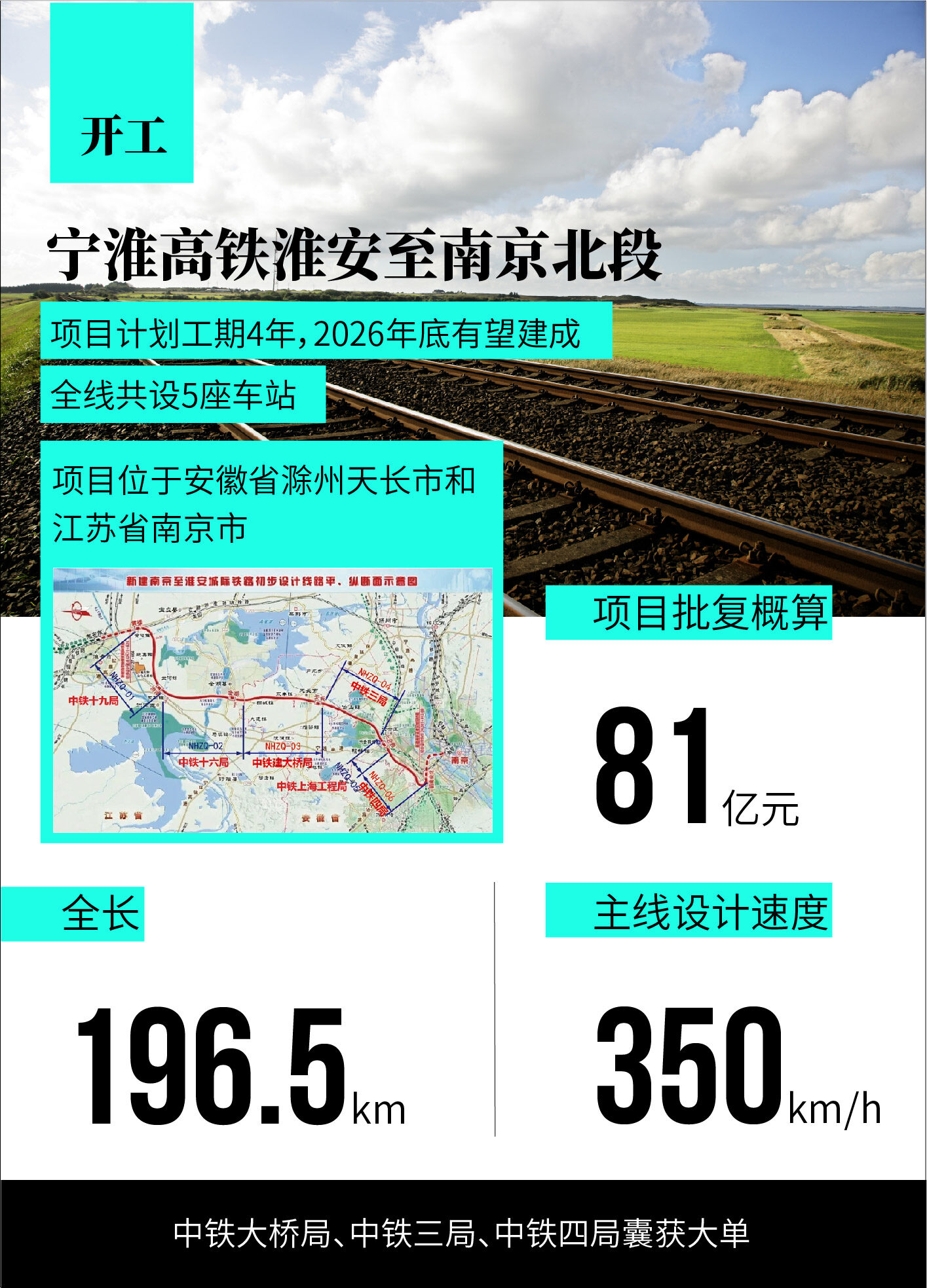 2023年6月26日,新建南京至淮安城际铁路剩余站前工程03、04、06标段施工标中标候选人公示发布,三个标段中标总金额80.7亿元。