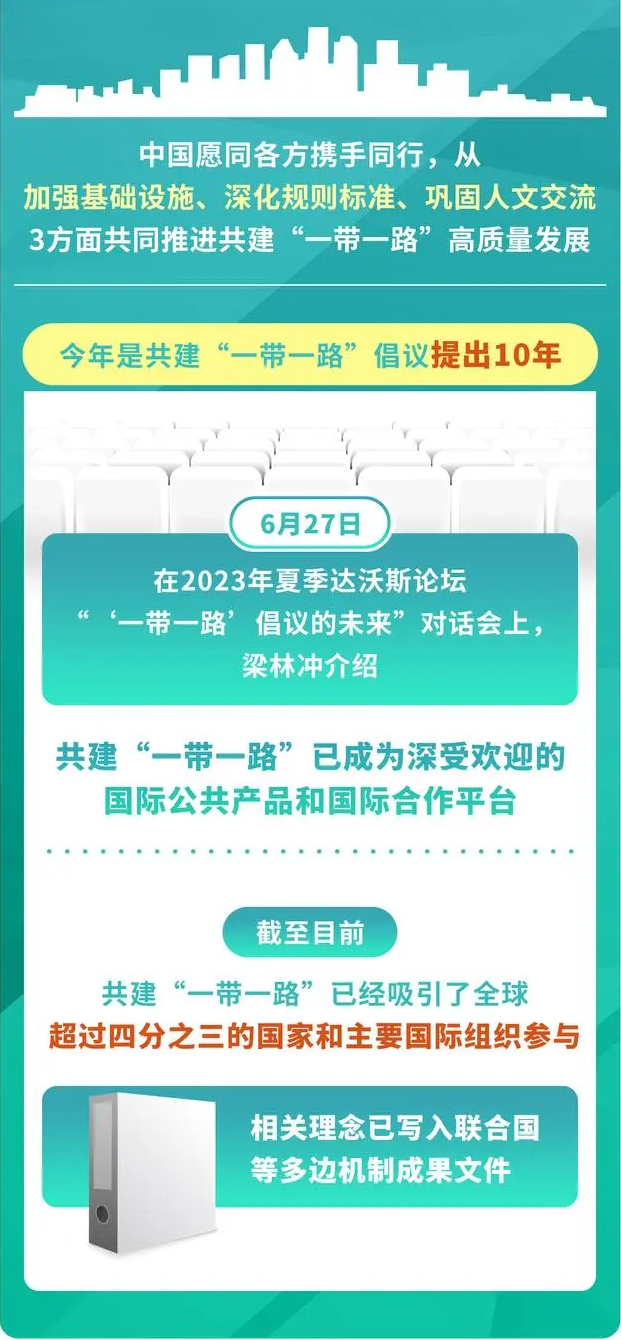 2023年6月27日,在夏季达沃斯论坛一带一路倡议的未来对话会上,梁林冲介绍,共建一带一路已成为深受欢迎的国际公共产品和国际合作平台。