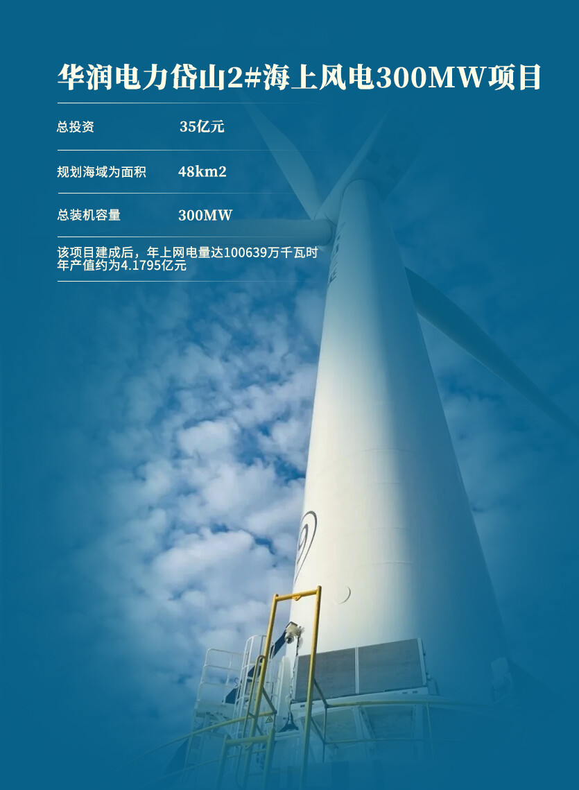 2023年6月28日,华润电力岱山2#海上风电300MW项目获得舟山市发改委批复核准,标志着华润电力在舟山投资的首个海上风电项目成功踏浪入海。