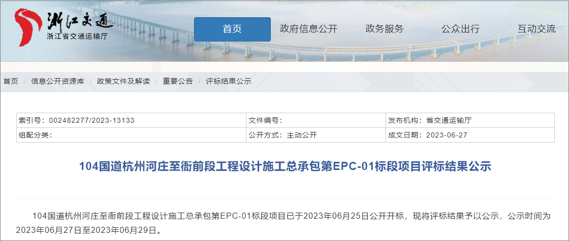 2023年6月27日,浙江省交通运输厅发布了104国道杭州河庄至衙前段工程设计施工总承包项目评标结果公示,该项目分为2个标段建设,均由当地强企中标,项目概算总投资约170.3亿元,概算建筑安装工程费约101.9亿元。