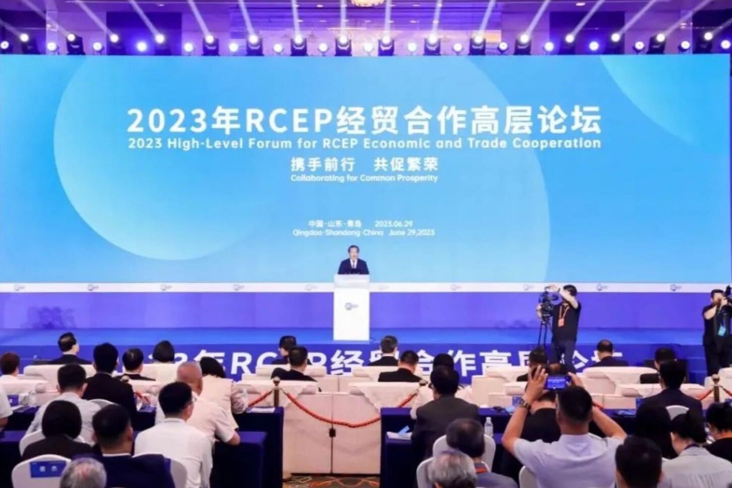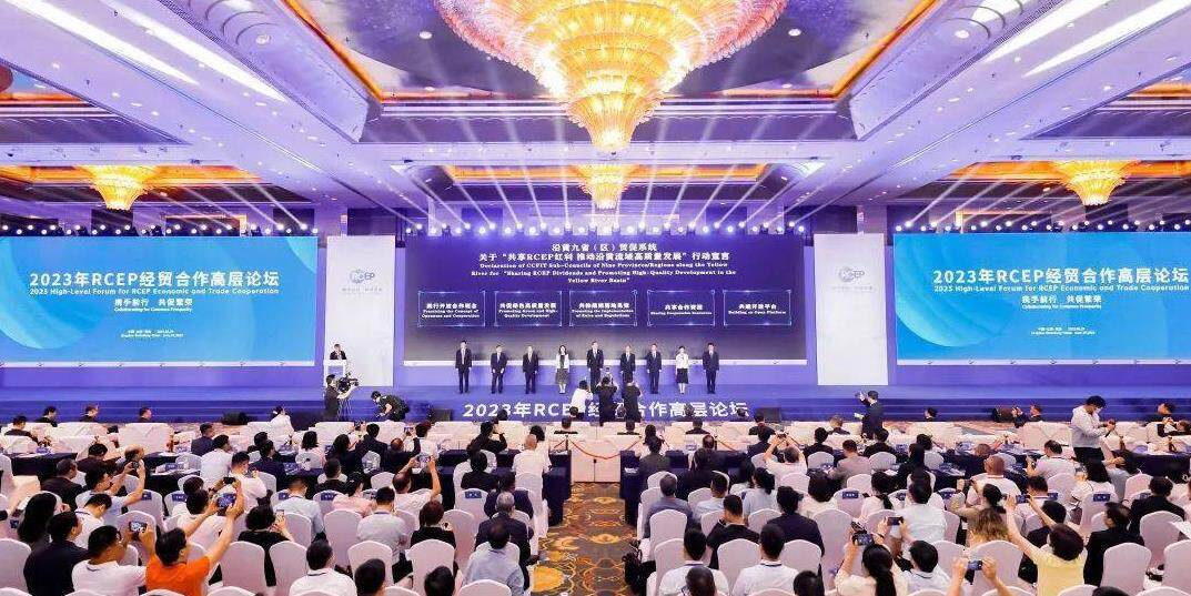 2023年6月29日,2023年RCEP经贸合作高层论坛在山东省青岛市开幕。中国贸促会会长、中国国际商会会长任鸿斌,山东省副省长范波,柬埔寨驻华大使凯·西索达,缅甸驻华大使吴丁貌瑞,菲律宾贸工部部长助理格伦·佩尼亚兰达,中日韩合作秘书处秘书长欧渤芊出席开幕式并致辞。印度尼西亚对华合作牵头人、海洋与投资统筹部长卢胡特,东盟秘书长高金洪,中国—东盟中心秘书长史忠俊视频致辞。山东省委副书记、青岛市委书记陆治原出席开幕式。青岛市副市长耿涛主持开幕式。山东省港口集团党委书记、董事长霍高原在会上作主旨演讲。