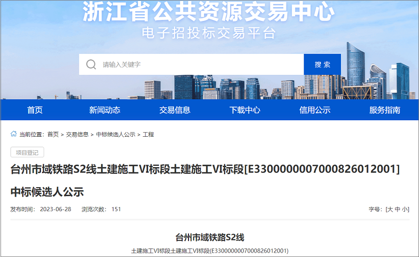 2023年6月28日,浙江省公共资源交易中心发布了台州市域铁路S2线土建施工中标候选人公示,本次中标3个标段,项目总投资约307.34亿元,计划于2027年建成。
