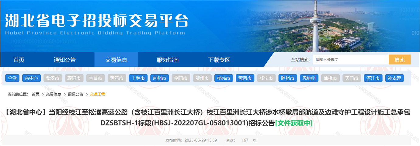 2023年6月29日,湖北省电子招投标交易平台发布了当阳经枝江至松滋高速公路(含枝江百里洲长江大桥)枝江百里洲长江大桥涉水桥墩局部航道及边滩守护工程设计施工总承包DZSBTSH-1标段招标公告,本项目概算总投资为158.21亿元,建设工期为48个月。