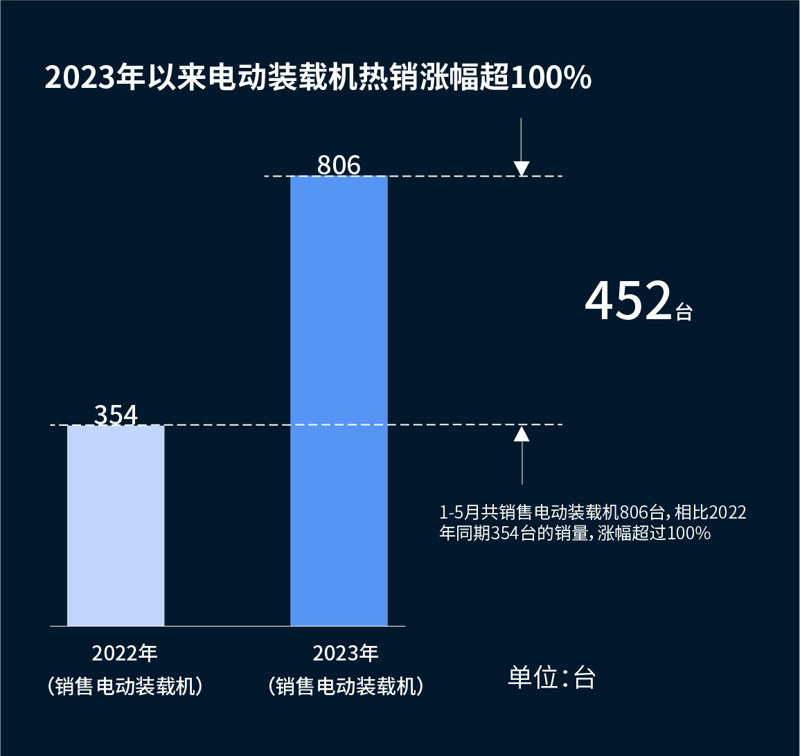 根据中国工程机械工业协会统计,2023年以来电动装载机单月销量呈逐月递增趋势,1-5月共销售电动装载机806台,相比去年同期354台的销量,涨幅超过100%。自2022年统计以来,电动装载机的市场占有率已从不足1%上升至超5%。这个统计数据还不包括博雷顿、诺浩等专注新能源工程机械设备制造的企业。