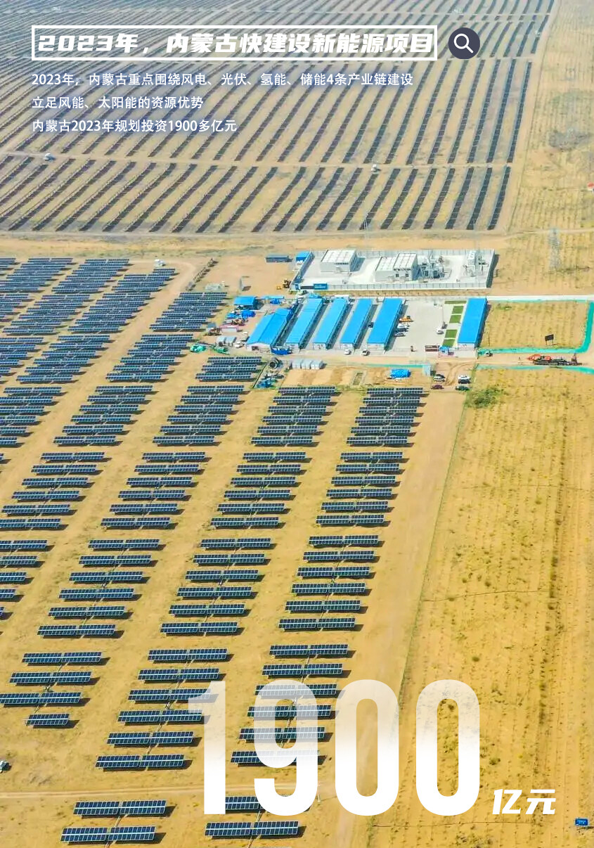 与此同时,内蒙古加速布局新能源产业。立足风能、太阳能的资源优势,内蒙古2023年投资1900多亿元,加快建设大型风光基地、风光制氢等项目。