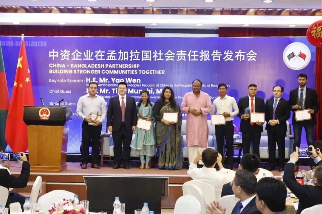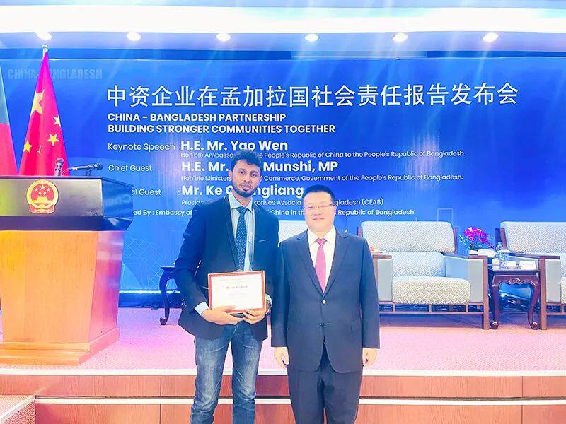 会上,中国驻孟加拉国使馆发布《在孟中资企业社会责任报告》,艾萨拉姆项目部孟籍员工Hasan Shahriar和其他5名孟加拉人被授予中孟大使友谊奖。
