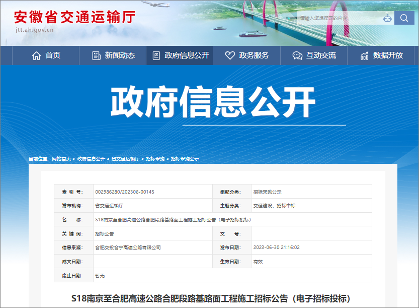 2023年7月4日,见道网记者从安徽合肥公共资源交易中心获悉,S18南京至合肥高速公路合肥段路基路面工程已启动招标,合同估算价为43亿元。