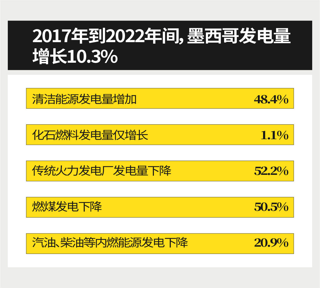 当前,墨西哥清洁能源发电整体呈快速上升趋势。根据墨西哥国家能源控制中心发布的最新数据,2017年到2022年间,墨西哥发电量增长10.3%,主要得益于清洁能源发展。其间,清洁能源发电量增加了48.4%;化石燃料发电量仅增长1.1%;传统火力发电厂发电量降幅最大,下降了52.2%;燃煤发电下降了50.5%;汽油、柴油等内燃能源发电下降了20.9%。