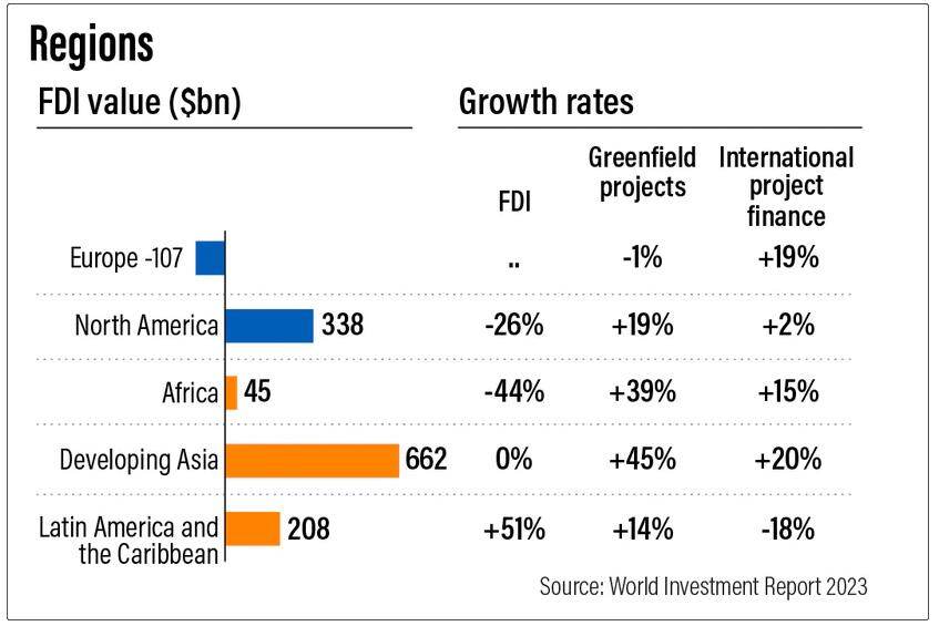 然而,由于单一金融交易,非洲的外国直接投资在2021年异常高位之后降至2019年的450亿美元水平。绿地项目公告增加了39%,国际项目融资交易增加了15%。亚洲发展中国家的外国直接投资流入量持平,为6620亿美元,但仍占全球外国直接投资的一半以上,印度和东南亚国家联盟成员国是最大的接受国。报告称,中国是世界第二大外国直接投资东道国,2022年增长了5%。流入拉丁美洲和加勒比的外国直接投资增加了51%,达到2080亿美元,是有记录以来的最高水平。